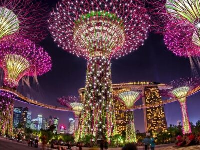 - Vườn thực vật Garden by the Bay: Khu vườn cây nhân tạo rộng hơn 100 ha, có tới hơn 250.000 loài thực vật Qúy hiếm, với các “Siêu cây” khổng lồ có khả năng tổng hợp năng lượng mặt trời vào ban ngày, tự tỏa sáng vào ban đêm và lọc sạch không khí. Toàn bộ dự án có tổng diện tích 101 ha , được chia làm 3 khu riêng biệt là: Bay South, Bay East và Bay Central (chỉ tham quan khu Bay South, không bao gồm vé tham quan bên trong các khu vườn trong nhà kính). Quý khách có thể trải nghiệm cảm giác hồi hộp và thích thú khi bước chân trên OCBC Skyway – Đường đi bộ trên không dài 128m nối giữa hai siêu cây, rất thích hợp để đi bộ vào bất cứ thời điểm nào, nơi có thể ngắm nhìn toàn bộ khu vườn và khung cảnh thành phố vịnh khu Marina Bay từ trên cao (chi phí tự túc)..