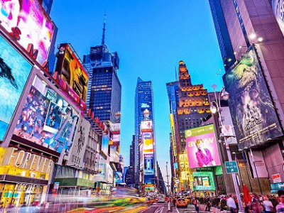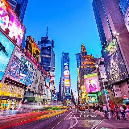 - Quảng trường thời đại (Times Square) – Quảng trường trung tâm thành phố New York rực rỡ với những ánh đèn màu và bảng quảng cáo.